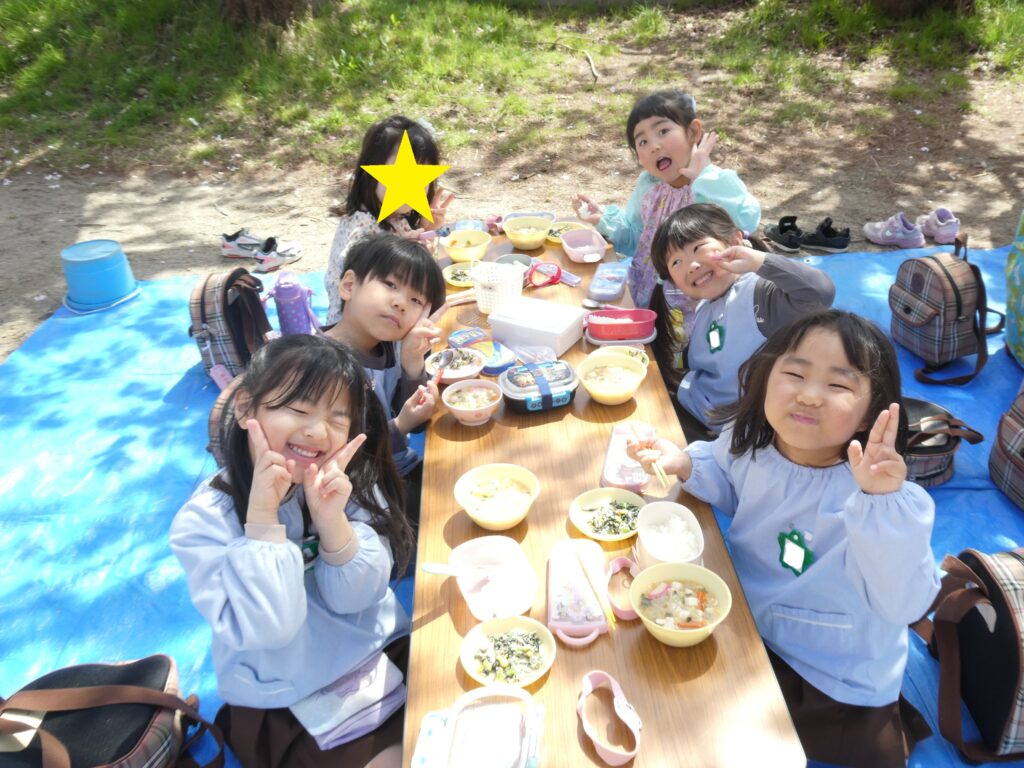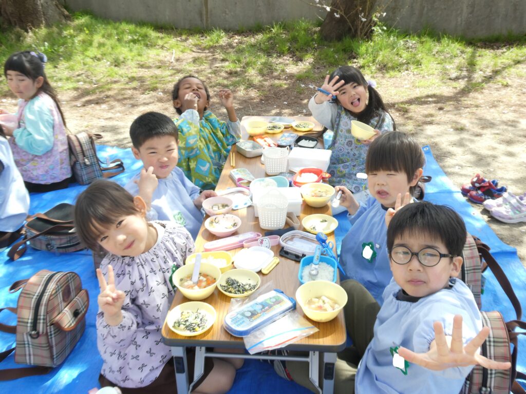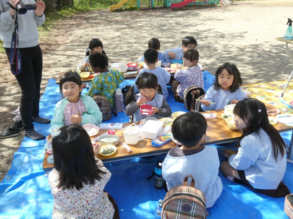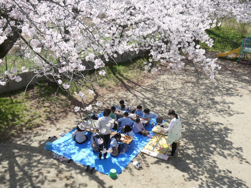 今日はゆりぐみさんが園庭でお花見給食をしました。