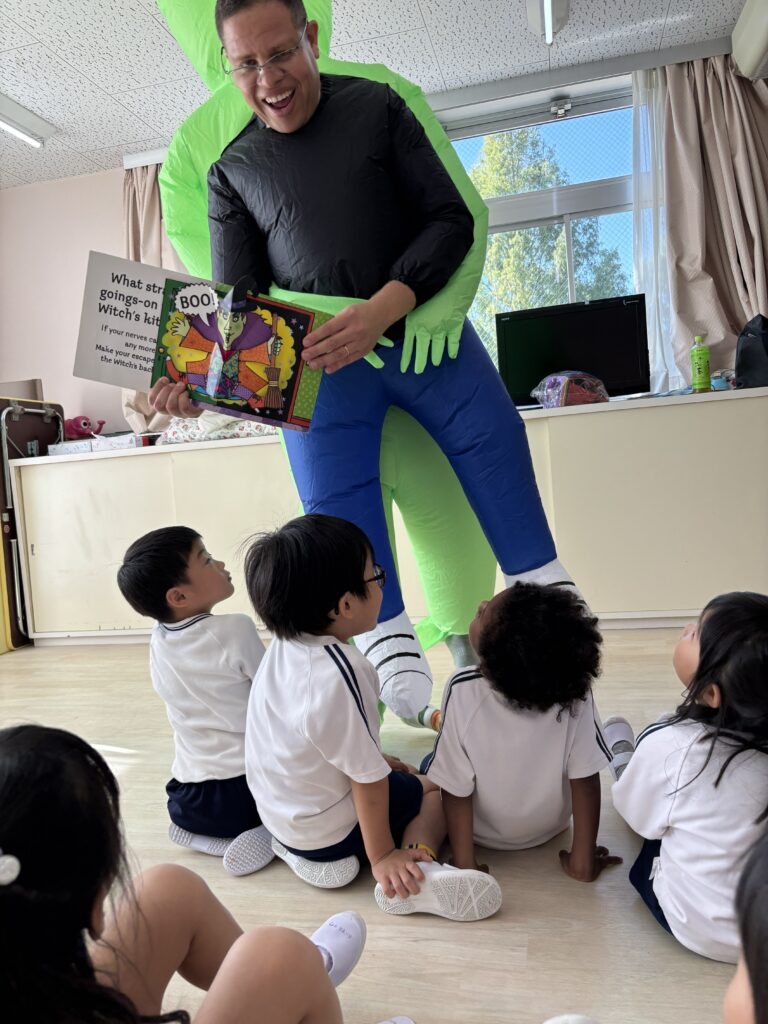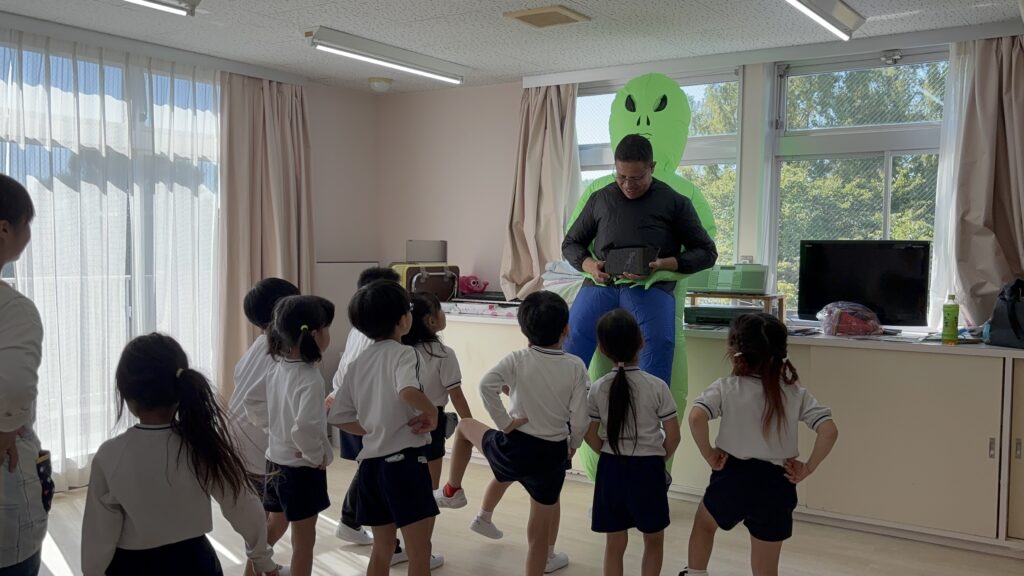 たのしいえいご 2025-10-15 行事 今日は毎月おこなっている「たのしいえいご」の時間がありました☺今月は特別!チアゴ先生が仮装姿できてくれました! みんなでハロウィンにちなんだ英語を教えてもらったり、身体を動かして遊んだり楽しみました♡ 投稿ナビゲーション 前の記事