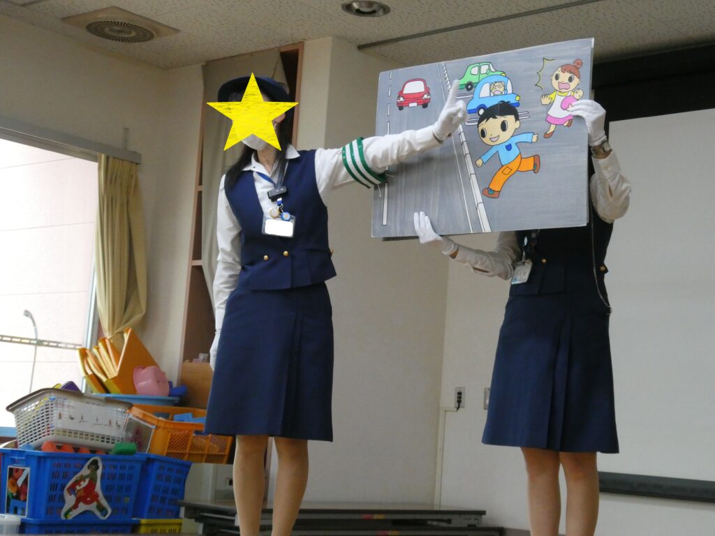 「赤は止まれ!」「右見て左見て渡るんだよね!」と自分の知っていることをお話したり、指導員さんからの交通安全のお話を真剣に聞いていたこどもたちでした!