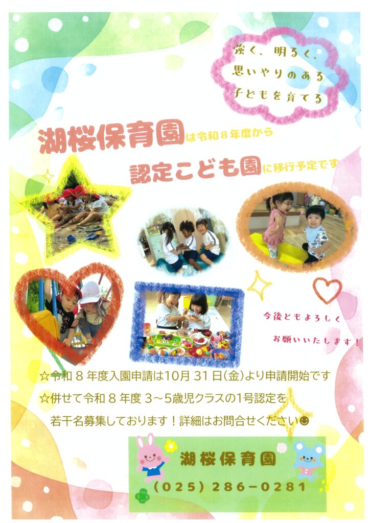 湖桜保育園は令和8年4月1日より「保育園」から「保育所型認定こども園」に移行する調整をしております。移行に伴って施設の名称も「こざくらこども園」に変更する予定ですが、現在の保育理念・機能(保育時間・開園日等)が変わることはありません。これからも子どもたち1人1人に寄り添い、安心できる環境のもとで子どもたちの主体的な活動や本来の力を十分に発揮していける保育・教育を目指し、職員一同努めてまいります。移行について疑問点、ご質問等ありましたらいつでもおしらせください。 保護者の皆様、地域の皆様のご理解とご協力をいただきながら、「子ども」「保護者」「園」が共に育ちあえる認定こども園として、今後も一層地域に根差した子育て支援・教育施設として精進してまいります。