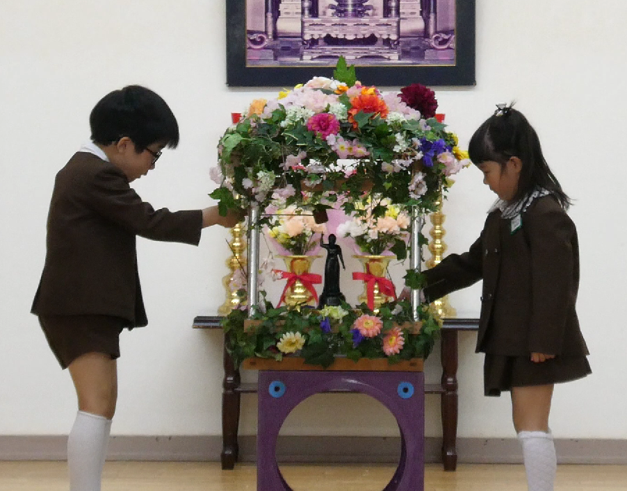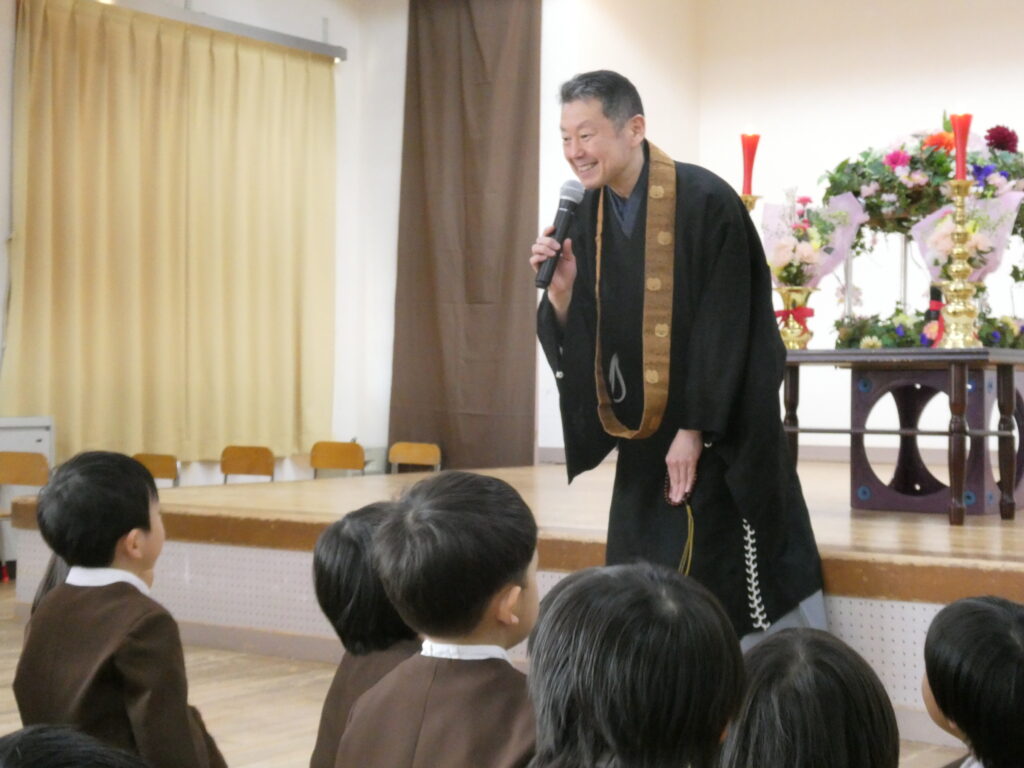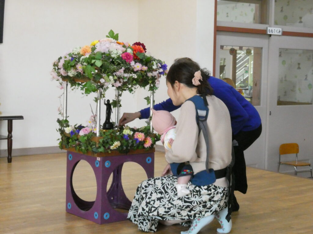 理事長先生にお釈迦様についてのお話を聞いたり、花まつりのお歌をうたってみんなでお祝いしました。